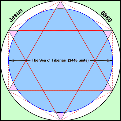 also known as the sea of Tiberias, just like the verse says! The red cross has a perimeter of 8,560 units." We examine this claim. Gleason has inscribed an hexagon within a circle of 8880 units circumference, and